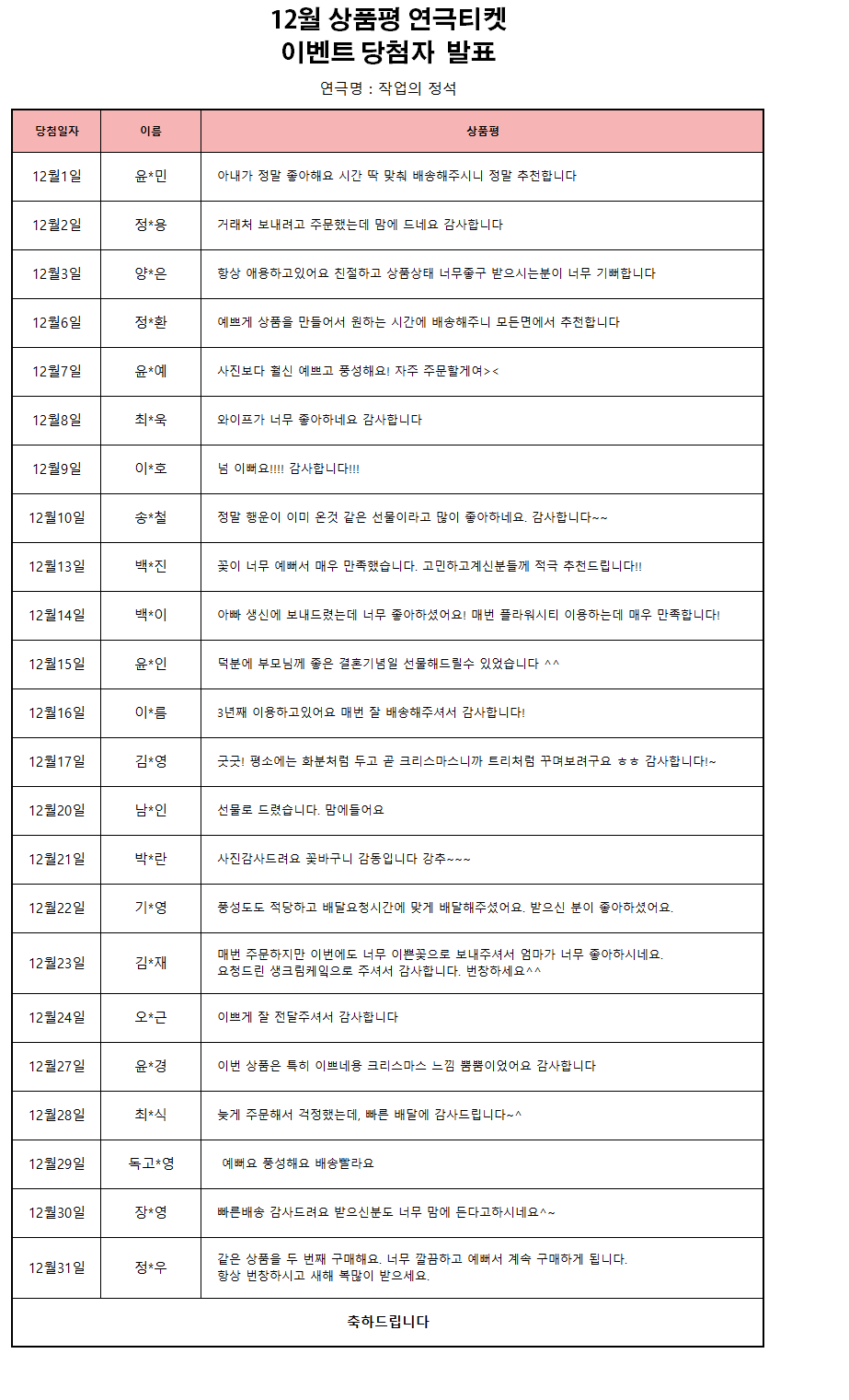 2021년 12월 상품평 연극티켓 이벤트 [당첨자발표]