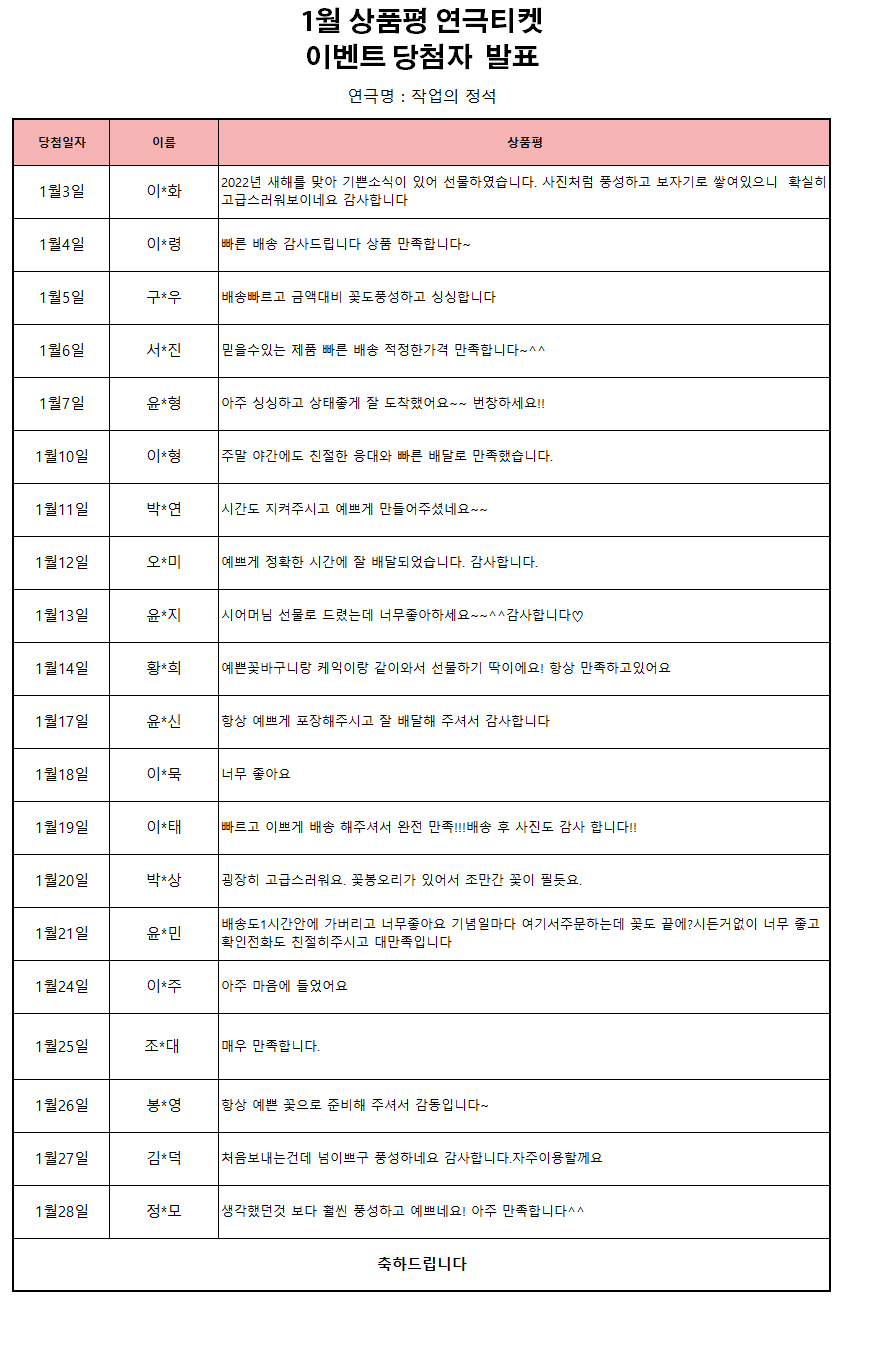 title : 2022년 1월 상품평 연극티켓 이벤트 [당첨자발표]