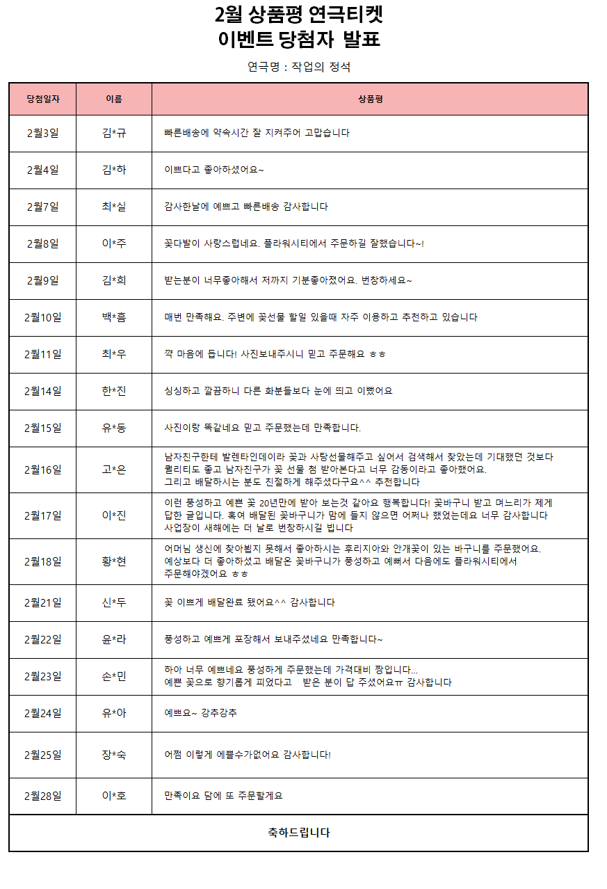 title : 2022년 2월 상품평 연극티켓 이벤트 [당첨자발표]