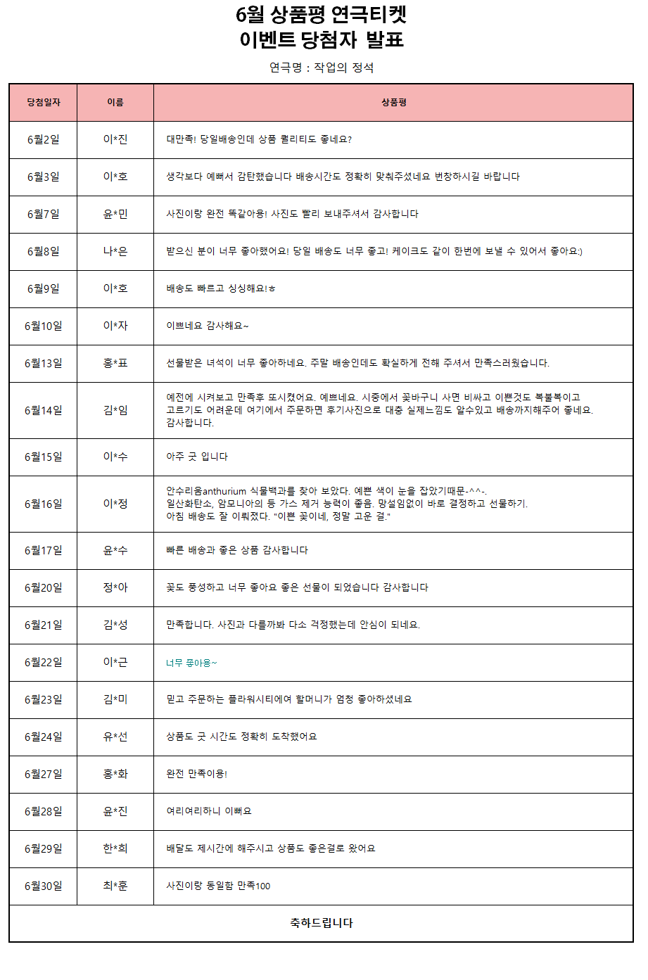 * 당첨자분들께 개별 연락 드렸으나 부재중으로 티켓 수령을 하지 못한 고객님께서는